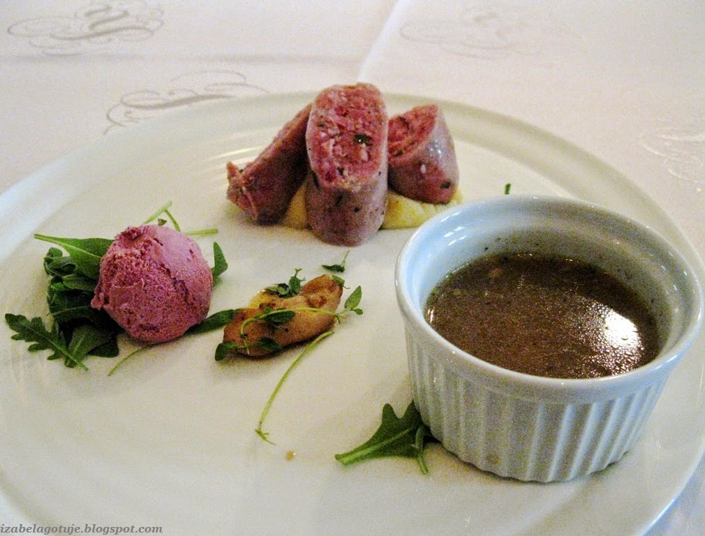 Nic specjalnego. Porcja malutka, mięso ekstremalnie wysuszone.. potencjał był duży, ale według mnie zupełnie zmarnowany.. (smaczny blin z sosem kurkowy i asysta śliwkowa w postaci galaretki i musu).